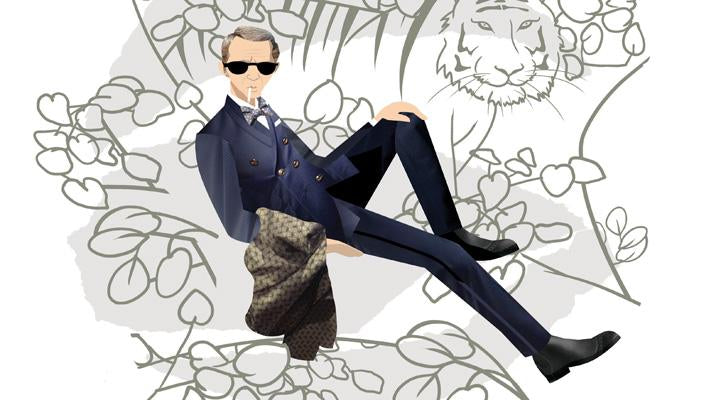 We've redressed the gentlemen of the silver screen in dapper designs from our spring/summer ‘16 portfolio. Above, Steve McQueen plays a confidently cavalier role in a navy double-breasted blazer and bow tie. True to character, a racer stripe accent gives his trousers an adventurous spirit.