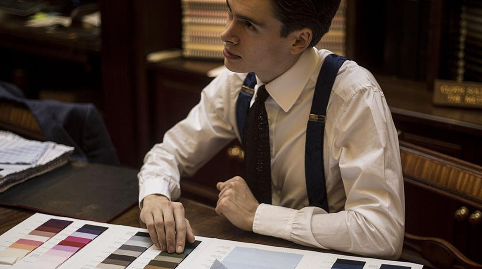Browse our selection of ALUMO cloth shirts in-store or online here. Further fabrics are available in Bespoke. Pictured in the lead image is Mr. Mathias Le Fèvre, going through our ALUMO swatches during his bespoke fitting.