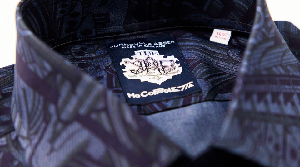 This year we have collaborated with Coppoletta and The Rake once more, following the success of our previous project culminating in the ‘Furious Eagle’ pocket square and the sartorial ‘Mega-Square.’ This latest partnership, Deco-Industrial, sees the creation of three denim shirts, each of which are stand-out pieces in their own right. “It made sense for the next collaboration to be in the area of shirts,” says Head of Design, Dean Gomilsek-Cole, “as we are renowned for our skills in this area and we had plenty of ideas left over from our initial discussions. Mo and I had been looking at many different inspirations from industrial shipyards to art deco and old propaganda posters, and if you look closely at the design you will see many of these ideas hidden within Mo’s artwork.”