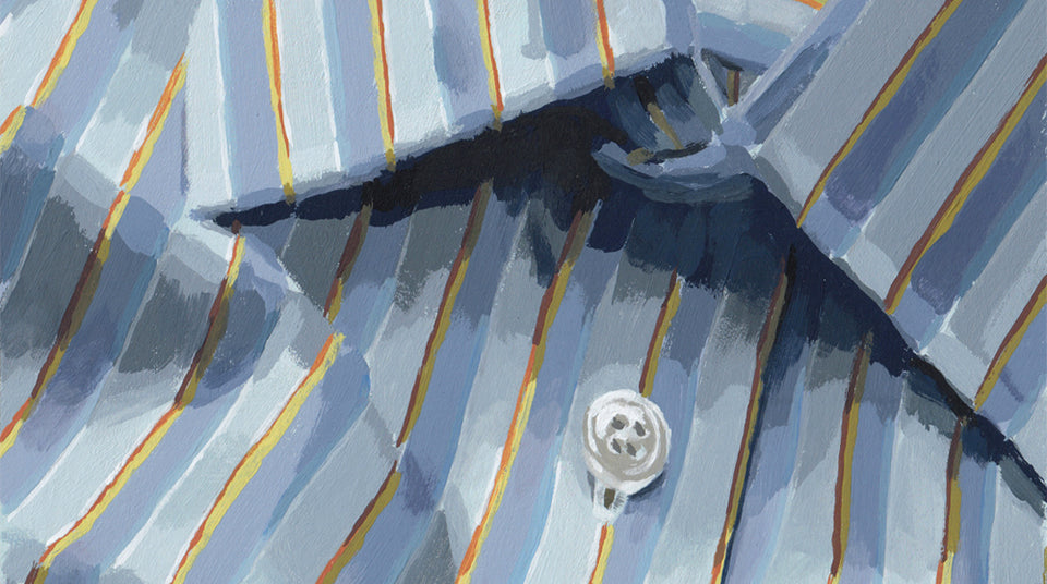 Today we design our striped fabrics digitally, but we still refer back to these archive books for inspiration, discovering bold and brave designs painted in gouache. Now, illustrator Samuel Kerr has painted one of this spring’s exclusive striped shirts in traditional gouache with its corresponding palette alongside, celebrating this historic technique.