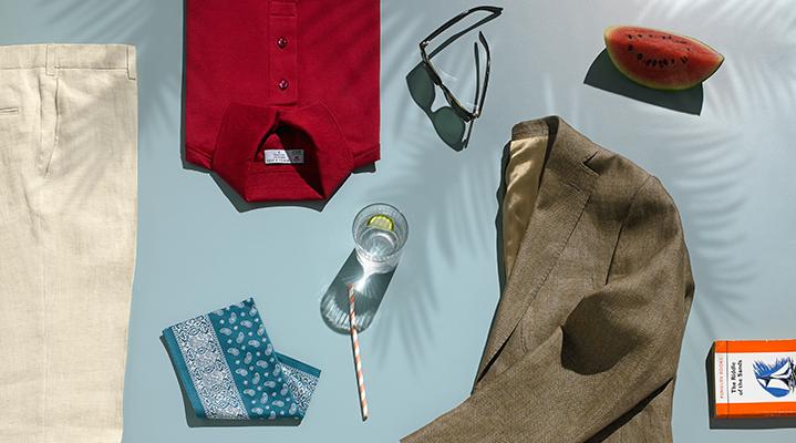 Pack two jackets, one dark and one light, which you can interchange throughout the week – fabric-wise, linen and super-light seersucker are best. Linen jackets from Turnbull & Asser are perfect for this – pop in to one of its stores to find them. When it comes to colour, shades of sky blue and navy are the most flattering against tanned skin. Just be sure to get an iron sent to your room – linen doesn’t travel well, after all.
